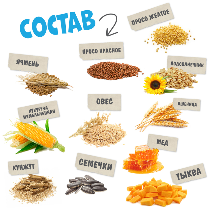 Просо желтое, просо красное, пшеница, ячмень, овес, подсолнечник, кукуруза измельченная, мед, кунжут, семена тыквы