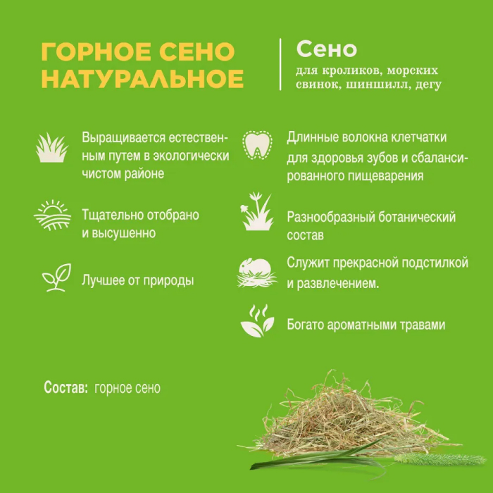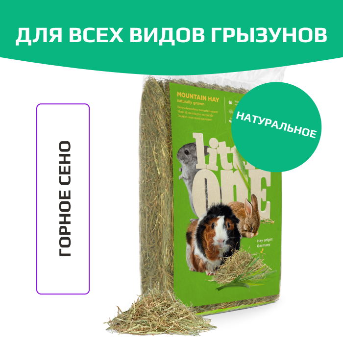Горное сено Little One - ароматное, очищенное и высушенное; собрано в экологически чистых горных районах. Сено является основной составляющей рациона всех травоядных животных (кроликов, морских свинок, шиншилл, дегу), поэтому важно обеспечить его постоянное наличие в клетке. Сено Little One имеет разнообразный ботанический состав. Оно богато грубой клетчаткой, что необходимо для здоровья зубов и оптимального пищеварения декоративных животных. Так как животные могут зарываться в сушеной траве и строить из нее гнезда, сено также служит прекрасной подстилкой и развлечением для всех домашних питомцев.