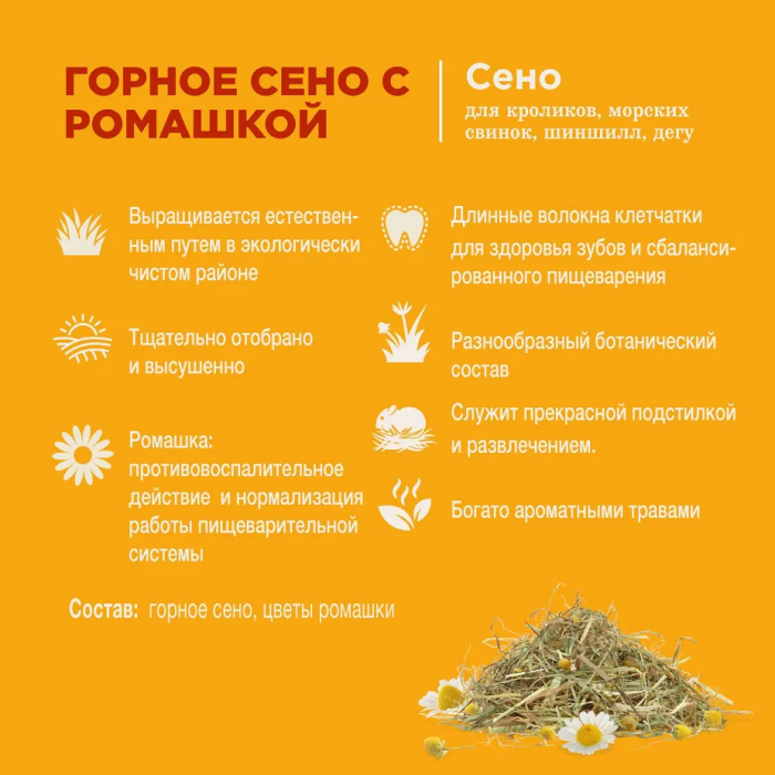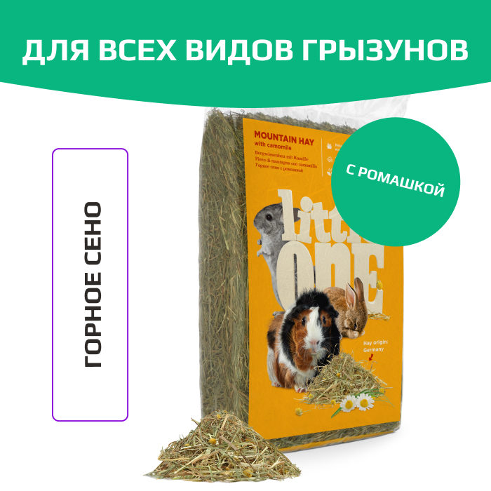 Горное сено с ромашкой Little One — ароматное, очищенное и высушенное; собрано в экологически чистых горных районах и обогащено цветами ромашки. Сено является основной составляющей рациона всех травоядных животных (кроликов, морских свинок, шиншилл, дегу), поэтому важно обеспечить его постоянное наличие в клетке. Сено Little One с ромашкой имеет разнообразный ботанический состав. Оно богато грубой клетчаткой, что необходимо для здоровья зубов и оптимального пищеварения декоративных животных. Ромашка уменьшает газообразование и нормализует работу желудочно-кишечного тракта. Обладает мягким противовоспалительным эффектом. Так как животные могут зарываться в сушеной траве и строить из нее гнезда, сено также служит прекрасной подстилкой и развлечением для всех домашних питомцев.
