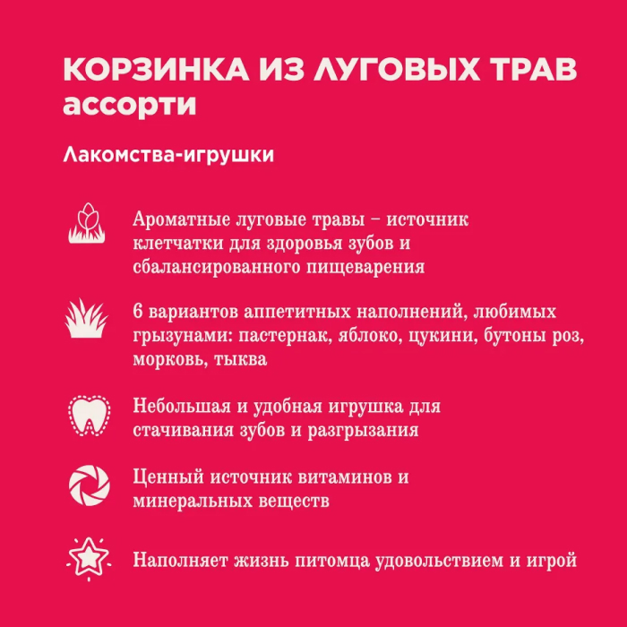 Лакомство-игрушка для всех видов грызунов и кроликов. Корзинка изготовлена из ароматных луговых трав и наполнена одним из шести вкусных и полезных ингредиентов: пастернак, цукини, морковь, яблоко, бутоны роз или тыква. Корзинка станет занимательной игрушкой для питомца, идеально подойдет для стачивания зубов, а также обогатит рацион витаминами, минеральными веществами и клетчаткой, необходимой для правильного пищеварения грызунов и кроликов.
