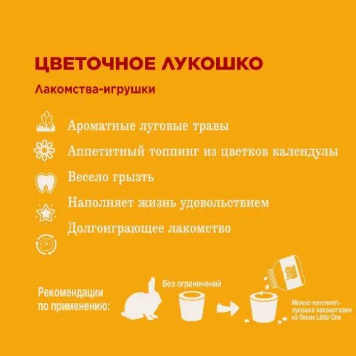 Цветочное лукошко Little One – это великолепное лакомство-игрушка с цветками календулы и полезными травами для всех видов грызунов! Little One – лучшее от природы для Вашего питомца!