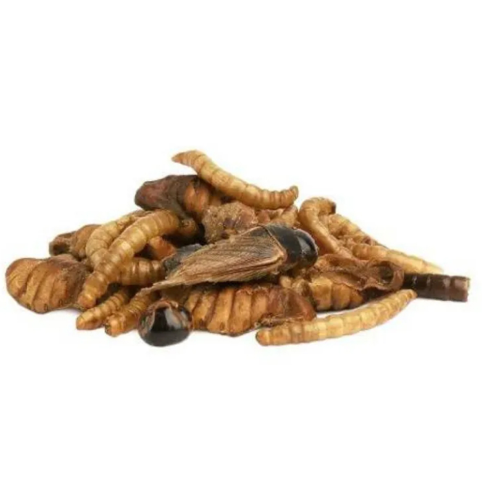 Смесь насекомых является вкусным и питательным дополнительным кормом для всеядных грызунов, а также ценным источником важных макро- и микронутриентов. Ее состав идеально сбалансирован и включает в себя сушеные куколки тутового шелкопряда, личинки мухи чёрной львинки, мучных червей и сверчков. Благодаря входящим в состав насекомым cмесь является ценным источником животного белка, необходимого в рационе всеядных грызунов, а также полезных жирных кислот, которые благотворно влияют на состояние кожи и шерсти питомца. В дополнение к важнейшим макронутриентам смесь служит хорошим источником усваиваемого кальция, фосфора и магния, полезных для зубов и костей, а также хитина - источника нерастворимой клетчатки, позволяющей снижать проявления аллергических реакций и препятствующей усвоению избыточного количества жиров.