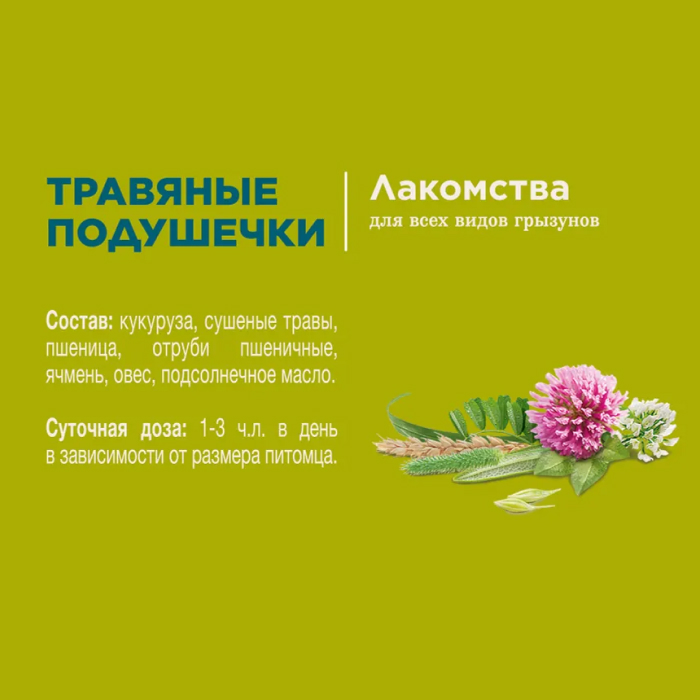 Лакомство «Травяные подушечки» является источником клетчатки, которая стимулирует пищеварение, и хорошим инструментом для стачивания постоянно растущих зубов у грызунов. Можно использовать как лакомство, а также как инструмент для общения с питомцем и его дрессировки.