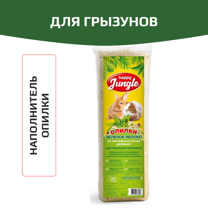 Опилки Happy Jungle натуральный гигиенический наполнитель из лиственных пород деревьев. Древесные опилки Зеленое яблоко эффективно справляются с неприятным запахом и отлично впитывают влагу, обладают высокими природными антисептическими свойствами. Мягкая текстура приятна и безопасна в использовании, не повреждает лапки и живот вашего зверька. В составе не содержится хвоя и смолы, поэтому такие опилки являются безопасными для содержания питомца. Подходят для всех видов декоративных животных: хорьков, ежей, морских свинок, дегу, шиншилл, декоративных кроликов, хомяков, крыс, мышей, песчанок, белок и бурундуков, луговых собачек. Утилизировать древесный наполнитель нужно в мусорное ведро. С приобретением опилок Хэппи Джангл ваш зверек будет вам благодарен.