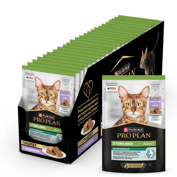 Нежный паштет с индейкой PRO PLAN® Sterilised MAINTENANCE — это полнорационный влажный корм, созданный ветеринарными специалистами и диетологами специально для стерилизованных кошек. Этот рацион создан с учетом особых потребностей стерилизованных кошек:
